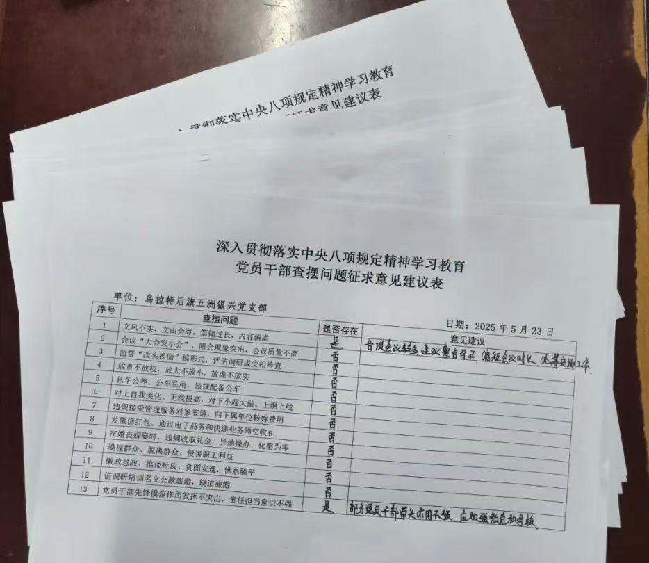 會上,大家對標習近平總書記關于加強黨的作風建設的重要論述和重要指示批示精神,對照《中央八項規(guī)定及其實施細則精神》,結合各自工作實際,堅持實事求是和問題導向原則,從思想引領、遵規(guī)守紀、作風建設、以學促干以及工作成效等方面做了全面查擺和自查自糾。同時緊扣中央八項規(guī)定內容,從文風會風、推諉扯皮、擔當作為、公款旅游、隔空送禮等方面編制、印發(fā)了《黨員干部查擺問題征求意見表》,認真聽取黨員群眾的意見和建議。